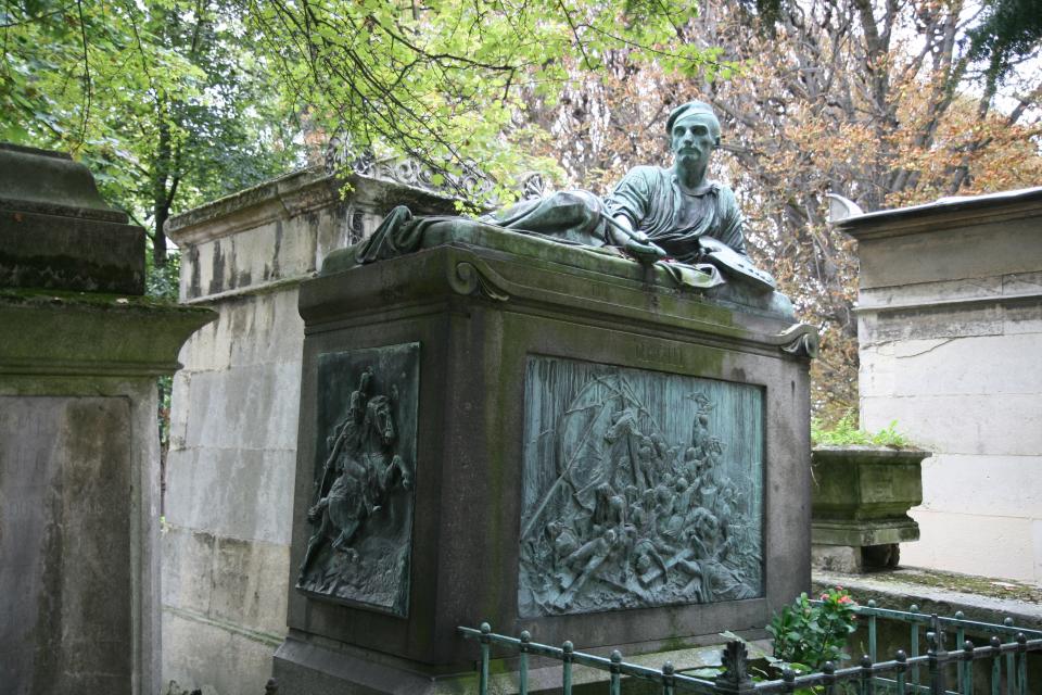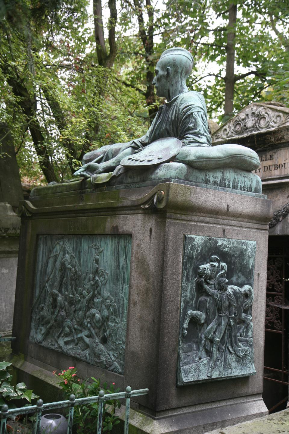 Géricault's tomb at Père Lachaise cemetery. He reclines, and plaques of his most famous paintings are on the sides.