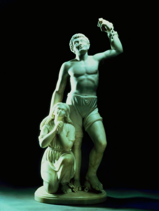 “…it was not until Edmonia Lewis’s sculpture Forever Free in 1867, that a Black subject but a Black artist was made wholly central, resistant, and emotionally distinct. During this period, Lewis was unique as an activist Black woman sculptor, but also as an artist who defied European conventions. While the sculpture Forever Free observes both a neoclassical and romantic style, the sculpture’s subject matter is both Black and independent. In this way, Lewis disrupts the traditional neoclassical subjects that would have been her academic models….