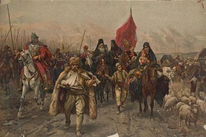 Migration of the Serbs is a subject with a complicated history. A painting with this subject was commissioned by the Serbian Patriarch Georgije Branković to be exhibited at the Millenial Exhibition held in Budapest in 1896. This subject was appropriate because it concerns the migration of Serbs in the late seventeenth century from Kosovo, where they had lived for centuries, to a region called Vojvodina. Vojvodina (today, mostly in Serbia) at that time was inhabited mainly by Hungarians who had lost much of their former territory to the Ottomans.