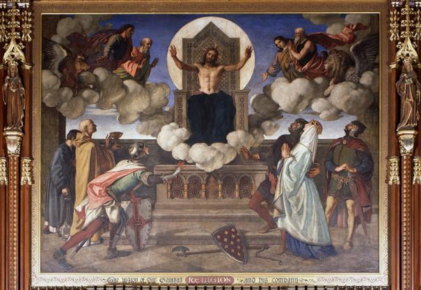 “The total pictorial concept of Religion approximated to a Florentine altar-piece (the style of the throne accentuating this) in which Sir Galahad and company occupy the position of donors. The fresco is charged with dramatic force but, in sacrificing the proximity of Christ to the knights as described by Malory, Dyce lost an equally important element. The intimacy of the occasion is what is remarkable in the textual version, Christ descending, becoming real, approaching humanity. Even a middle-of-the-road Anglican like [poet Alfred] Tennyson ignored this quality and described Galahad’s vision vicariously in a terrifying futuristic landscape. It is scarcely surprising then that Dyce rejected normalcy in Mallory’s description.”